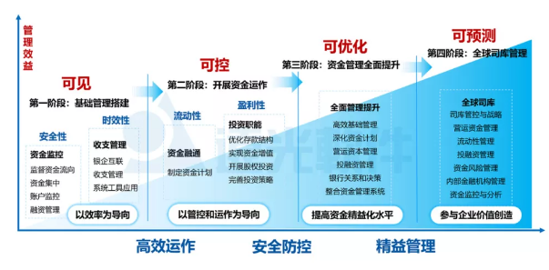 司庫管理注重強(qiáng)化營運(yùn)資金、流動性、資本結(jié)構(gòu)、利率匯率風(fēng)險(xiǎn)和融資的管控,通過司庫體系建設(shè),企業(yè)可將資金被動管理轉(zhuǎn)變?yōu)橹鲃庸芾?、超前管理,?shí)現(xiàn)集團(tuán)各類金融資源可視、可控和增值,成為集團(tuán)戰(zhàn)略落地的堅(jiān)實(shí)保障。