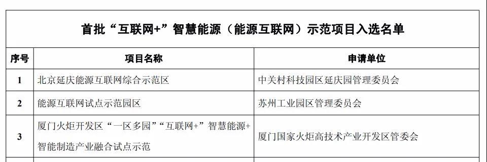 “廈門火炬開發(fā)區(qū)‘一區(qū)多園’‘互聯(lián)網(wǎng)+’智慧能源+智能制造產(chǎn)業(yè)融合試點(diǎn)示范”項(xiàng)目屬于國家能源局首批“互聯(lián)網(wǎng)+”智慧能源(能源互聯(lián)網(wǎng))示范項(xiàng)目之一,項(xiàng)目牽頭單位為廈門國家火炬高技術(shù)產(chǎn)業(yè)開發(fā)區(qū)管理委員會(huì),項(xiàng)目于2017年3月6日在國家能源局網(wǎng)站公示。