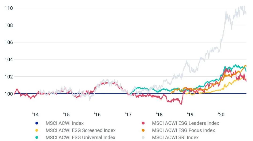 圖:相對(duì)基準(zhǔn)的MSCI ACWI ESG指數(shù)系列表現(xiàn)