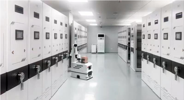 此外,還通過(guò)引入智能制造、物聯(lián)網(wǎng)技術(shù),結(jié)合票據(jù)交收設(shè)備、裝盒設(shè)備、AGV機(jī)器人、智能密集架、智能檔案盒等智能終端,實(shí)現(xiàn)實(shí)物檔案從交收、裝盒、歸檔全過(guò)程的無(wú)人自動(dòng)化管理,并與線上電子檔案對(duì)接匹配,強(qiáng)化一體化管理。