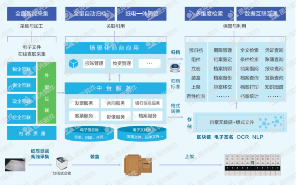 遠(yuǎn)光“智慧檔案”是遠(yuǎn)光軟件基于在電子檔案多年的研究與實(shí)踐,深度融合區(qū)塊鏈、人工智能、大數(shù)據(jù)、邊緣計(jì)算、物聯(lián)網(wǎng)等新興技術(shù),精研軟硬一體化整合應(yīng)用,遵循電子票證管理標(biāo)準(zhǔn)和規(guī)范,將電子檔案系統(tǒng)與智能設(shè)備相結(jié)合,推出的全新一體化解決方案,滿足了企業(yè)對(duì)檔案的全生命周期流程的管理需求,為檔案管理工作進(jìn)行全面賦能。