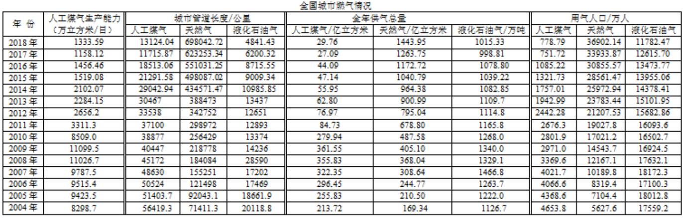 根據(jù)中國(guó)國(guó)家統(tǒng)計(jì)局的數(shù)據(jù)可以看出,在城市范圍內(nèi)人工煤氣的產(chǎn)量、管線長(zhǎng)度和用氣人口在逐年下降,液化石油氣的管線長(zhǎng)度和用氣人口也是逐年下降。而天然氣的城市管線長(zhǎng)度、供氣量和用氣人口卻逐年上升。