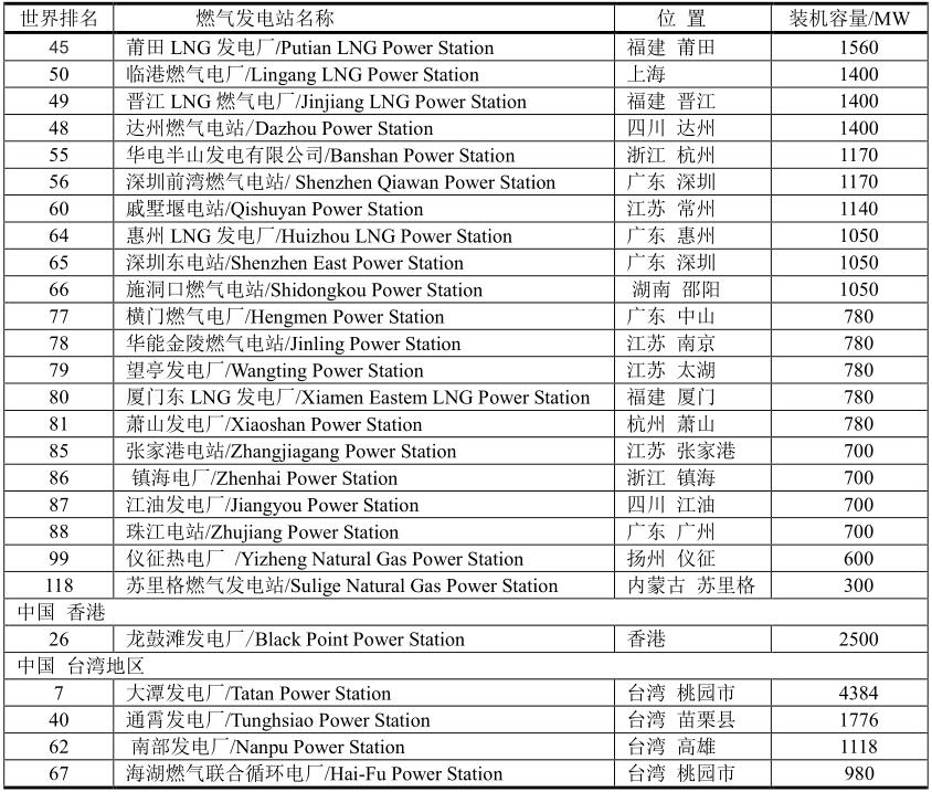 中國(guó)最大的燃?xì)獍l(fā)電站在中國(guó)臺(tái)灣地區(qū)—大潭發(fā)電廠(Tatan Power Station),其次是香港—龍鼓灘發(fā)電廠(Black Point Power Station)。