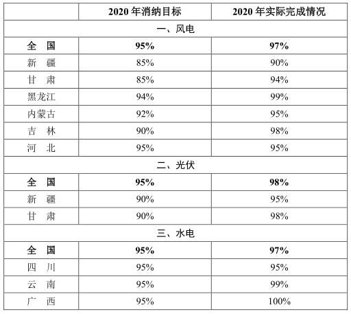 根據(jù)2018年國家發(fā)展改革委、國家能源局印發(fā)的《清潔能源消納行動計劃(2018-2020年)》(發(fā)改能源規(guī)〔2018〕1575號),所確定的分年度風(fēng)電、光伏和水電消納目標(biāo),2020年全國平均風(fēng)電利用率97%,超過2020年風(fēng)電利用率目標(biāo)2個百分點,重點省區(qū)全部達(dá)到了2020年消納目標(biāo);全國平均光伏發(fā)電利用率為98%,超過2020年利用率目標(biāo)3個百分點,重點省區(qū)全部達(dá)到了2020年消納目標(biāo);全國主要流域水能利用率97%,超過2020年利用率目標(biāo)近2個百分點,重點省區(qū)全部達(dá)到了2020年消納目標(biāo)。