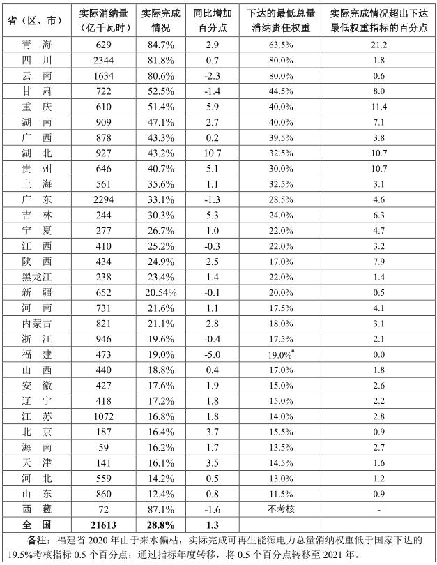 根據(jù)《國家發(fā)展改革委 國家能源局關(guān)于印發(fā)各省級行政區(qū)域2020年可再生能源電力消納責(zé)任權(quán)重的通知》(發(fā)改能源〔2020〕767號)公布的2020年各省(區(qū)、市)可再生能源電力消納責(zé)任權(quán)重,綜合考慮各省本地生產(chǎn)、本地利用以及外來電力消納情況,經(jīng)核算,除西藏免除考核外,全國30個省(區(qū)、市)都完成了國家能源主管部門下達(dá)的總量消納責(zé)任權(quán)重和非水電消納責(zé)任權(quán)重。