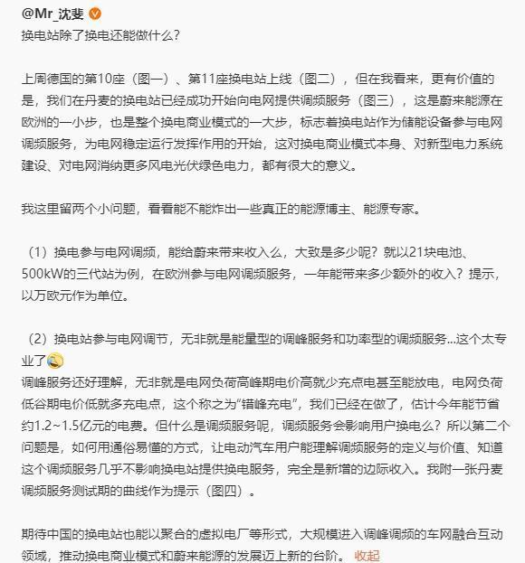 近日,智車派注意到,蔚來副總裁沈斐在微博發(fā)文稱,在丹麥的換電站已經(jīng)成功開始向電網(wǎng)提供調(diào)頻服務(wù),這是蔚來能源在歐洲的一小步,也是整個換電商業(yè)模式的一大步,標(biāo)志著換電站作為儲能設(shè)備參與電網(wǎng)調(diào)頻服務(wù)。沈斐表示,期待中國的換電站也能以聚合的虛擬電廠等形式,大規(guī)模進(jìn)入調(diào)峰調(diào)頻的車網(wǎng)融合互動領(lǐng)域。