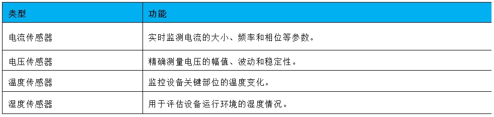 通過(guò)安裝在電力設(shè)備上的電流、電壓、濕度等各類傳感器,采集設(shè)備運(yùn)行參數(shù)。其功能見(jiàn)表3。