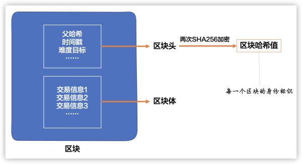 每一個區(qū)塊由區(qū)塊頭和區(qū)塊體構成。區(qū)塊頭由父哈希(上一個區(qū)塊的哈希值)、時間戳、難度目標等信息構成,區(qū)塊體由交易記錄和其他信息構成。區(qū)塊頭經(jīng)過兩次SHA256加密算法得到區(qū)塊哈希值,哈希值是區(qū)塊的身份標識符,與身份證號碼類似,具有唯一性。嚴格來說,區(qū)塊哈希值并不包含在區(qū)塊結構內(nèi)。
