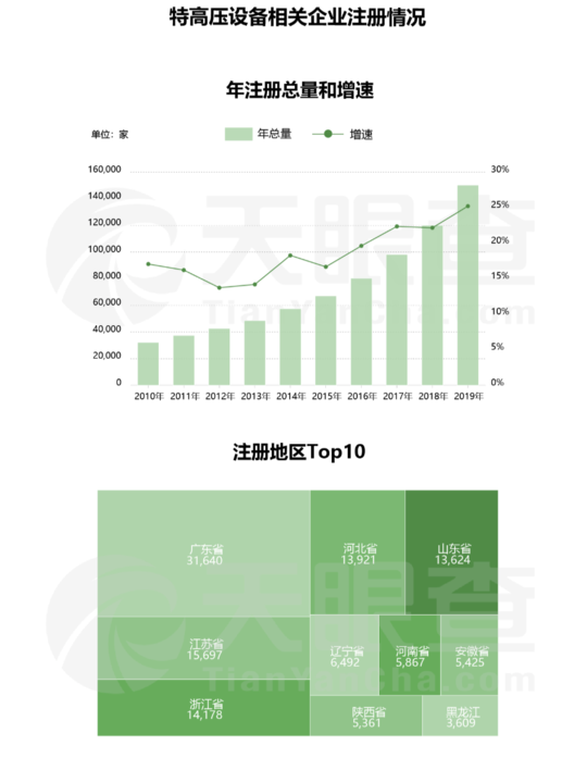 天眼查專業(yè)版數據顯示,我國特高壓相關設備企業(yè)有15萬家,其中A股上市公司有超過60家。具體來看,特高壓設備企業(yè)近十年增速呈波動上升趨勢,2019年增速達到峰值,為25.22%,當年共新增超3萬家相關企業(yè)。另外,特高壓設備企業(yè)較為集中分布在廣東省和江蘇省,與電力企業(yè)分布基本一致,值得注意的是,廣東省相關企業(yè)數量為江蘇省的2倍多。