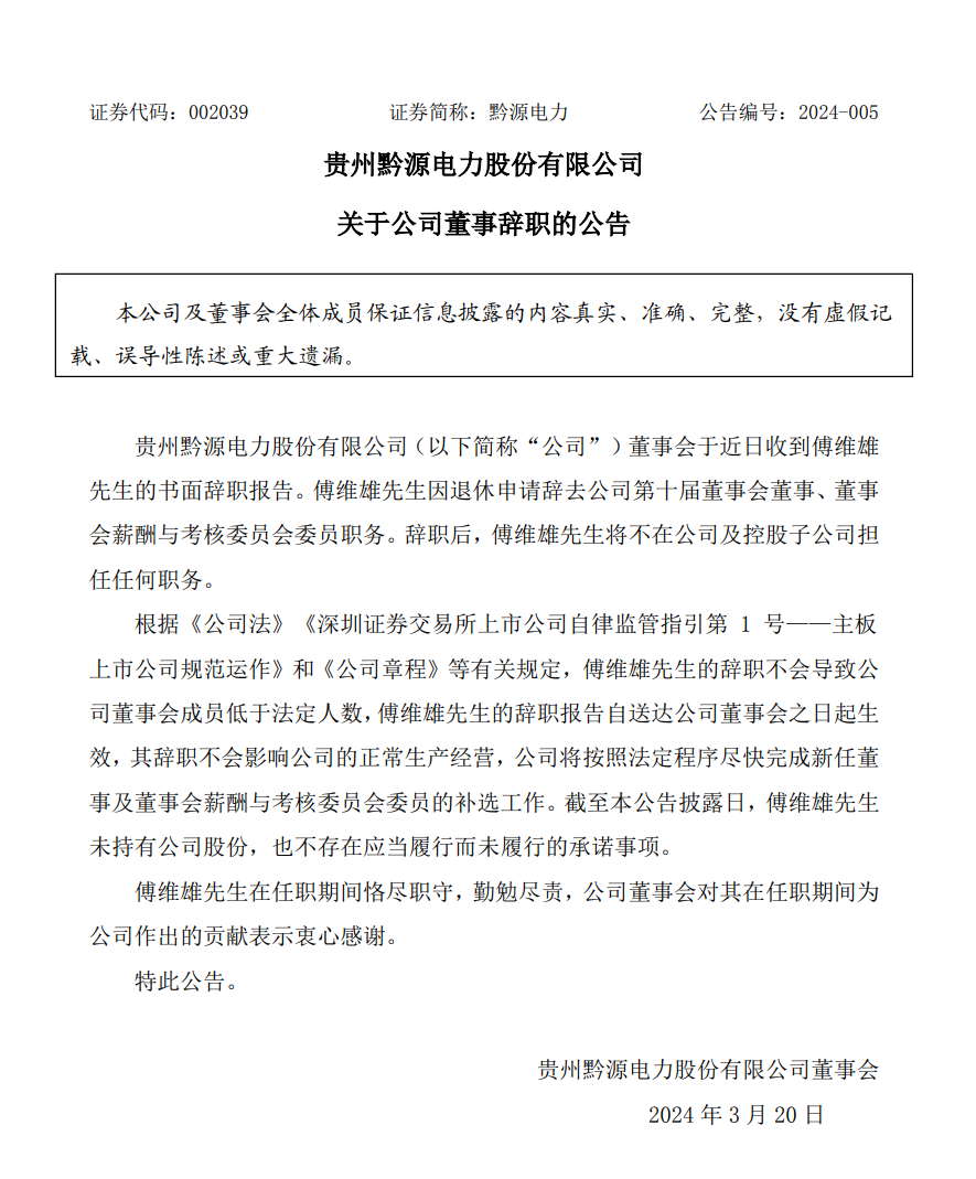 3月20日,黔源電力發(fā)布公告稱,公司董事會于近日收到傅維雄先生的書面辭職報告。傅維雄先生因退休申請辭去公司第十屆董事會董事、董事會薪酬與考核委員會委員職務。辭職后,傅維雄先生將不在公司及控股子公司擔任任何職務。