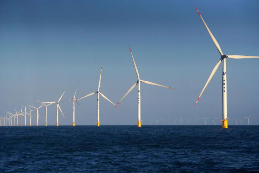三月中旬,黃海之濱,海風(fēng)凜冽。從山東海陽港碼頭出發(fā),海上航行兩個半小時后,就看見在蔚藍(lán)遼闊的海天之間,一臺臺百米高的白色“大風(fēng)車”列陣迎風(fēng)旋舞,不遠(yuǎn)處,白藍(lán)相間印有華能標(biāo)識的海上升壓站分外吸睛。