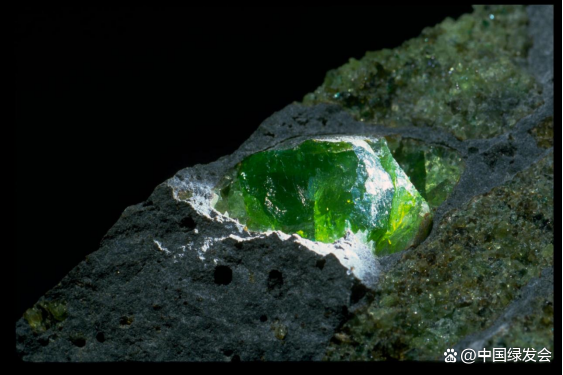 (鎂橄欖石,一種橄欖石礦物。地下水與橄欖石相互作用會(huì)導(dǎo)致氫氣在周圍巖層中積聚。圖片來(lái)源:史密森尼國(guó)家自然歷史博物館。)