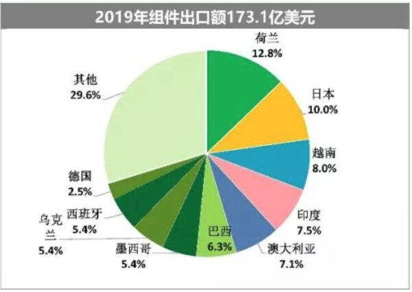 據(jù)中國光伏行業(yè)協(xié)會(huì)統(tǒng)計(jì),2019年,中國組件出口國排名前十的有荷蘭、日本、越南、印度、澳大利亞、巴西、西班牙、墨西哥、烏克蘭、德國,共占總出口量的70.2%。這十個(gè)國家中,亞洲國家三個(gè)、歐洲國家四個(gè)。