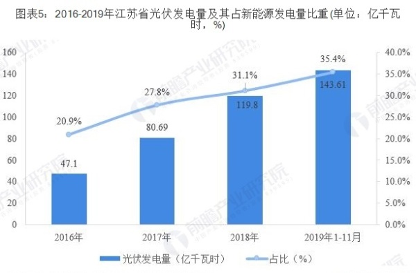 據(jù)江蘇省電力行業(yè)協(xié)會(huì)統(tǒng)計(jì)數(shù)據(jù)顯示,2016年以來(lái),江蘇省光伏發(fā)電量穩(wěn)步增長(zhǎng),2016年,全省光伏發(fā)電量?jī)H為47.1億千瓦時(shí),到2019年1-11月,已增長(zhǎng)至143.61億千瓦時(shí)。另外,光伏發(fā)電在江蘇省新能源發(fā)電中的市場(chǎng)份額也在逐步提升,2019年1-11月,江蘇省光伏發(fā)電量占新能源發(fā)電量的比重已提升至35.4%。