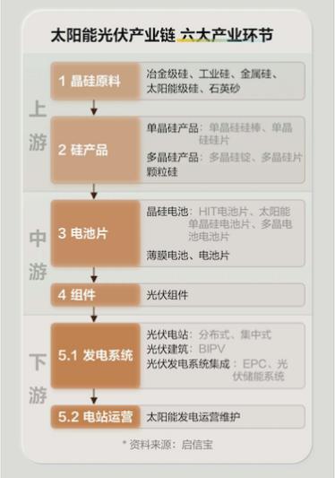 目前,我國太陽能光伏產(chǎn)業(yè)已經(jīng)形成比較完整的產(chǎn)業(yè)鏈結(jié)構(gòu),主要分為晶體硅與薄膜電池兩大類,產(chǎn)業(yè)鏈劃分為晶硅原料、硅產(chǎn)品、電池片、組件、發(fā)電系統(tǒng)、電站運營等6個環(huán)節(jié)。上游為晶硅原料、硅產(chǎn)品環(huán)節(jié);中游為電池片、組件環(huán)節(jié);下游為應(yīng)用系統(tǒng)等環(huán)節(jié)。