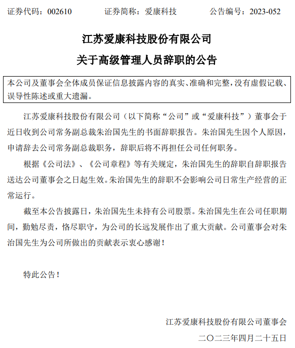 4月24日,愛康科技(002610.SZ)發(fā)布公告稱:董事會于近日收到公司常務(wù)副總裁朱治國先生的書面辭職報告。朱治國先生因個人原因,申請辭去公司常務(wù)副總裁職務(wù),辭職后將不再擔任公司任何職務(wù)。