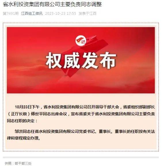 鄒洪同志任江西省水利投資集團(tuán)有限公司黨委書(shū)記、董事長(zhǎng)。