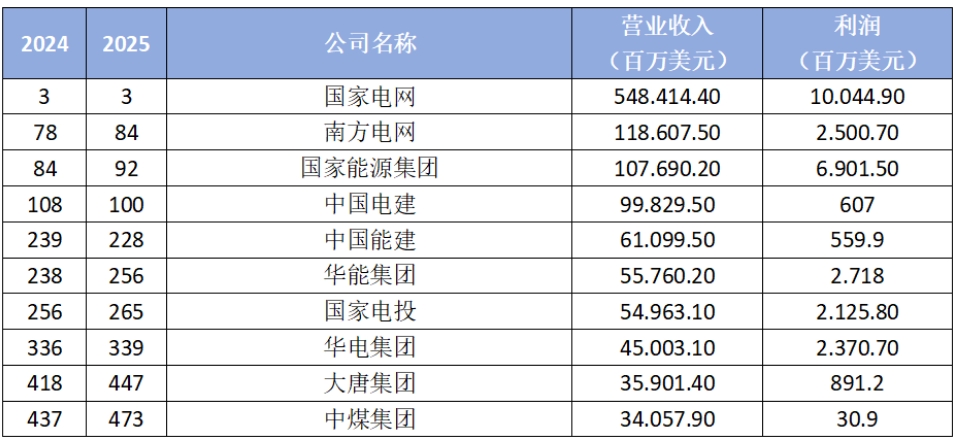 7月29日,2025年《財富》世界500強(qiáng)放榜,此次上榜門檻(最低銷售收入)從321億美元增長至322億美元。除國家電網(wǎng)外,電力央企排名均有小幅變化。