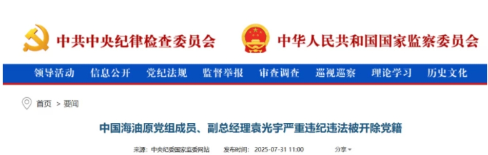 中央紀委國家監(jiān)委網(wǎng)站訊 經(jīng)中共中央批準(zhǔn),中央紀委國家監(jiān)委對中國海洋石油集團有限公司原黨組成員、副總經(jīng)理袁光宇嚴重違紀違法問題進行了立案審查調(diào)查。