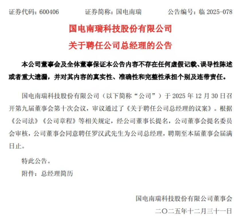 12月31日,國電南瑞發(fā)布公告,國電南瑞科技股份有限公司于2025年12月30日召開第九屆董事會第十次會議,審議通過了《關于聘任公司總經理的議案》。根據《公司法》《公司章程》等相關規(guī)定,經公司董事長提名,公司董事會提名委員會審核,公司董事會同意聘任羅漢武先生為公司總經理,聘期至本屆董事會屆滿日止。