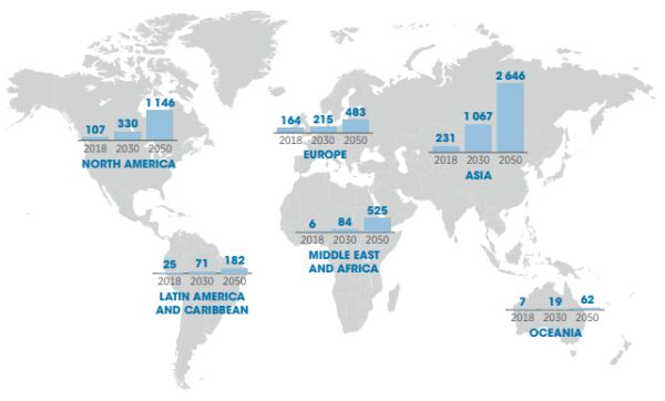 圖2 到2050年全球陸上風電裝機容量分布(單位:GW)