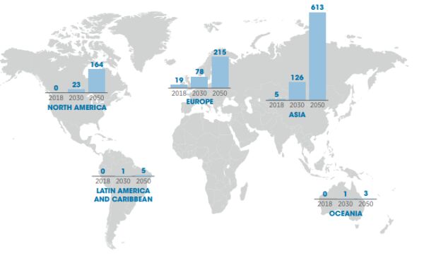 2018年,中國超過歐洲成為全球最大陸上風電市場,裝機容量占全球約1/3。展望未來,亞洲地區(qū)(主要是中國)將繼續(xù)主導陸上風電行業(yè),到2050年亞洲裝機容量將占全球裝機總容量的一半以上(其中中國裝機容量將超過2000 GW,印度則將超過300 GW),北美和歐洲將分別以23%和10%位列二、三位。亞洲還將主導全球海上風電裝機,到2030年裝機總量將達到126 GW,到2050年則將達到613 GW,其中中國到2030和2050年分別將達56 GW和382 GW。北美將是另一個新興海上風電市場,裝機容量將從目前的不到1 GW增長至2030年的近23 GW,到2050年則將進一步增至164 GW。