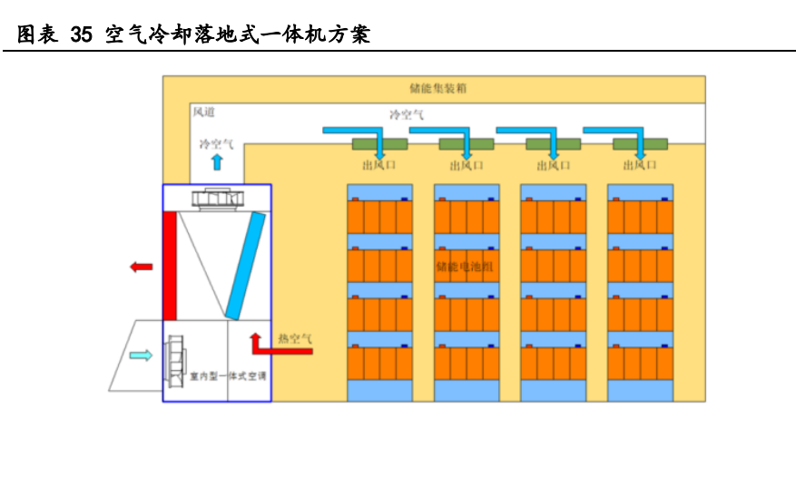 風(fēng)冷溫控系統(tǒng)一般由儲能溫控廠商直接提供整體系統(tǒng)產(chǎn)品,其中核心部件包括壓縮 機(jī)、風(fēng)機(jī)、換熱器等。風(fēng)冷具備方案成熟、成本低、結(jié)構(gòu)簡單等優(yōu)點,但同時由于空氣 的比熱容低,導(dǎo)熱系數(shù)低,風(fēng)冷一般應(yīng)用于功率較低場景。