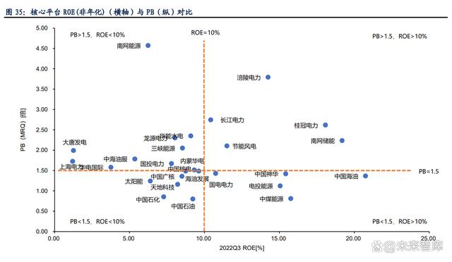 在 PB-ROE 模型中,全部 A 股上市公司的數(shù)據(jù)如下:2023/3/30 的 PB 為 1.57(MRQ), 2022 前三季度 ROE 為 8.99%。因此,我們將 PB=1.5,roe =10%作為標準進行篩選,對 PB 估值較低且資產(chǎn)收益率較高的核心平臺分為以下三類: (1) 第一類,ROE 大于 10%且 PB 小于 1.5 的公司:中煤能源,中國海油,中國神華, 電投能源,國電電力。 (2) 第二類,PB 略大于 1.5 但 ROE 表現(xiàn)良好的公司:節(jié)能風電。 (3) 第三類,ROE 略低于 10%且 PB 較低的公司:中國石油,中國廣核,中國石化,海 油發(fā)展,天地科技,中國核電。 從中長期來看,二級市場對股票的估值水平通常會隨著公司盈利能力的增強而上升,即 PB 與 ROE 理論上應當呈現(xiàn)正相關關系。我們認為,以上公司是目前處于低估狀態(tài)的能源央企 核心平臺,估值修復空間較大。